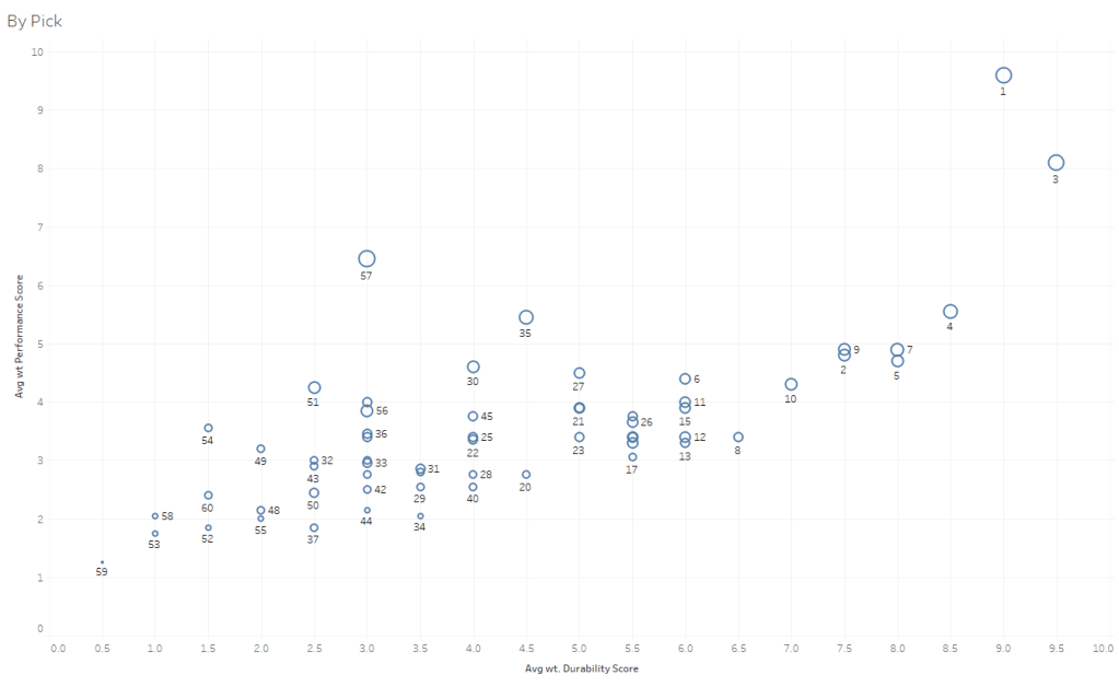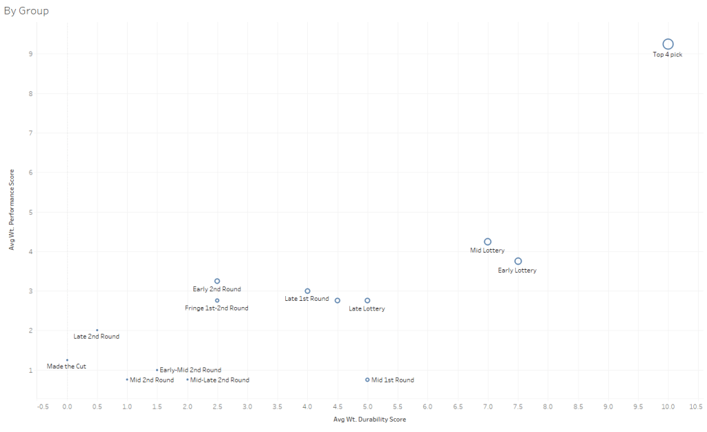 - There’s definitely a trap in the mid 1st round picks as the average performance is similar to the 2nd round picks. They have average durability, but perhaps that’s because GMs aren’t quick to pull the trigger on them because they overinvest in their expectations and / or coaches feel obligated to provide them the minutes because they were drafted relatively high.